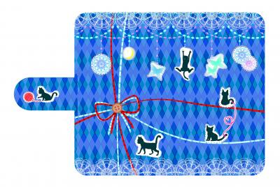 レース柄をバランスよく配置し、青いアーガイル柄の中で楽しく遊んでいる躍動感のあるネコを描きました。