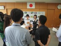 下の写真は、部長の3年生・堀井さんと2年生・金井さんへのメディアによるインタビュー風景と、制作した美術部員で記念撮影をしたものです。