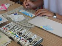 下の写真2枚は、かまぼこ板への彩色と夏の絵手紙制作中の様子です。鮮やかで涼やかな色彩に、涼を感じてください。