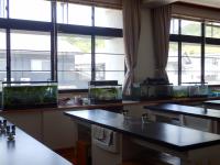 よ~く見ると、優雅に泳ぐ魚やエビ、のそのそ動くカメ……内子高校の水族館!