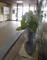 正面玄関、事務室前には、アジサイの花が飾られています。