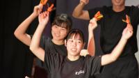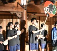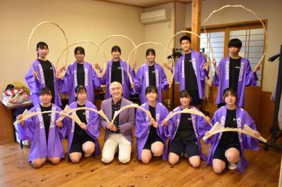 郷土芸能部員も舞台裏でお手伝いをさせていただく予定でしたが、せっかく内子座に行くのならと、演奏や演技にも参加させていただくことになり、舞台の上でも楽しい時間を過ごすことができました。特に、見るのも触るのも初めての「大江戸玉すだれ」の演技は、とてもよい経験になりました。