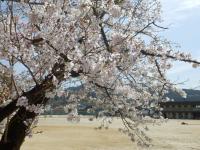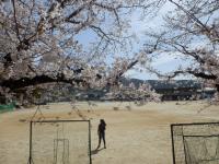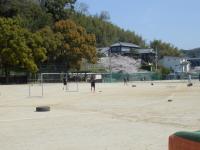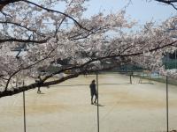 満開の桜越しに、グラウンドで部活動に励む生徒の姿を御紹介します。