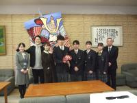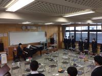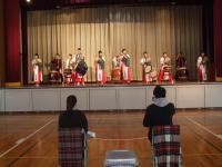 実は、お二人が到着されてすぐ、CMに出演した生徒たちが体育館に御案内し、サプライズで郷土芸能部の歓迎演奏を聴いていただきました。最初は驚かれていましたが、演奏が始まると手や足でリズムを取られるなど、非常に喜んでくださいました。演奏後は記念撮影をしながら、お褒めの言葉、感謝の言葉をたくさん、たくさんいただきました。部員たちは照れながらも、演奏をして喜んでくださる方がいることへの感謝の気持ちを新たにしたように思います。今後も感謝の気持ちを忘れず、新しい演奏の経験を求めてチャレンジを続けていってもらいたいです。