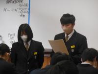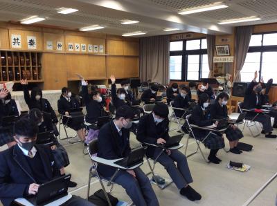 また、昨日3年生が下校した後には「えひめスーパーハイスクールコンソーシアム in 南予」が開催され、本校からは2年生の生徒会役員4名がオンラインで参加しました。3年生が不在の学校を2年生が支える時期になりました。