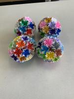 家庭クラブと合同で、施設への贈り物「くす玉」作りを行っています。七夕飾りとしても応用できそうです。折り紙を使い、伝統的な折り方で作っています。